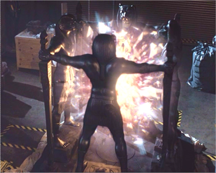 The Sun Cage consisted of four sculptures of Egyptian gods: Amon, Horus, Selkis and Toth each holding an inverted obelisk. The four statues were standing on a square plate of magnetite, in the center of which is a round disc, just below the site of opening of the Anomaly. At the corners of the plate are engraved hieroglyphics, which apparently describe the Sun Cage's function.